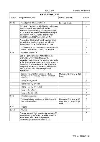 Test the inhalation resistance at 30 l/min and 95 Measured 0.6 mbar at 30 P